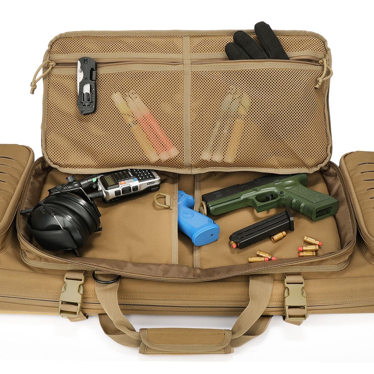 Durable Construction Material: Constructed by heavy-duty 600D nylon fabric exterior & interior. Padded on all side for increased protection. Removable protective pad keep your valuable firearm from wear also can be used as shooting mat.Safe & Spacious: Dual lockable zippers keep your firearms safe; 2 locks included in the package. Holds 2 rifles and 2 pistols; ample storage in the front for your range accessories. Molle compatible webbing for customization.Professional Rifle Bag: Rugged ballistic pack cloth construction; extra 2 outside accessory pouches fit all your need. Portable removable backpack w/storage pouches. Double stitching construction workmanship solid.Hold 2 RifleRefined Design & Functional: Double rifle case with more refined design; multiple compartments inside and out provide storage for just about anything you’ll want to carry. Fully customizable web and loop platform can carry all your other tactical accessories.